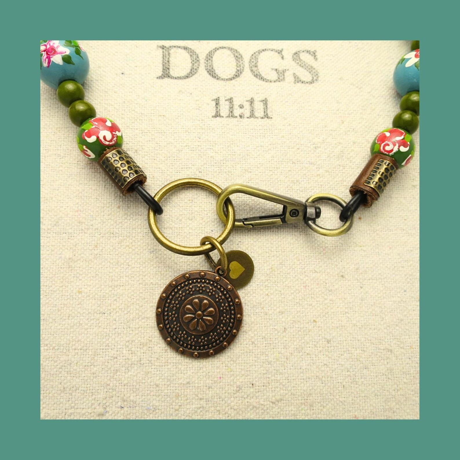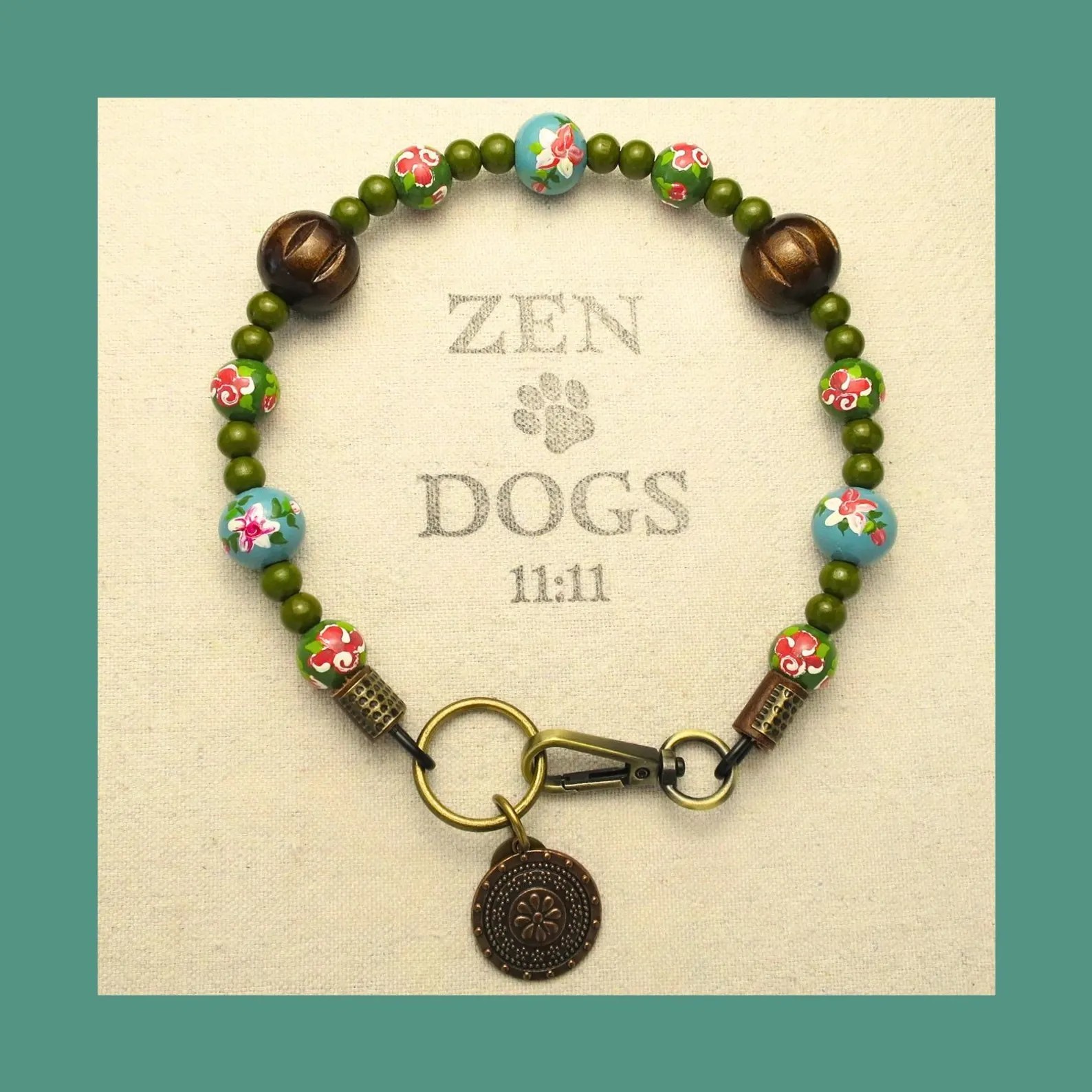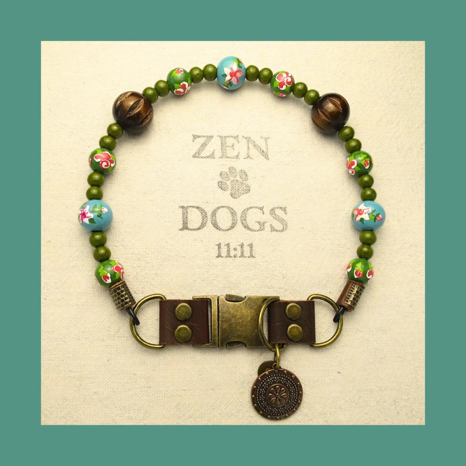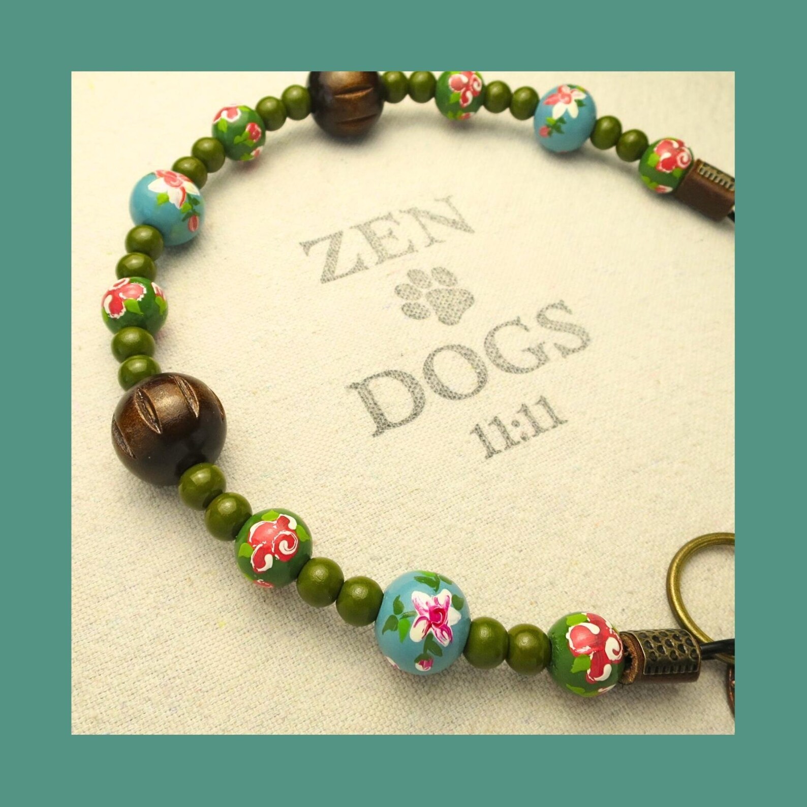dog collar, beaded dog collar, stylish dog collar, zen dogs collar, brass pendant, bone pendant, copper pendant, metal pendant, lotus flower, evil eye, paw print, hand painted beads, wooden beads, bone beads, nut beads, handmade dog collar, durable dog collar, exotic beads, one of a kind dog collars, mala beads, unique dog collar, pet accessories, designer dog collar, symbol of love, spiritual connection, spiritual dog accessory, mindfulness