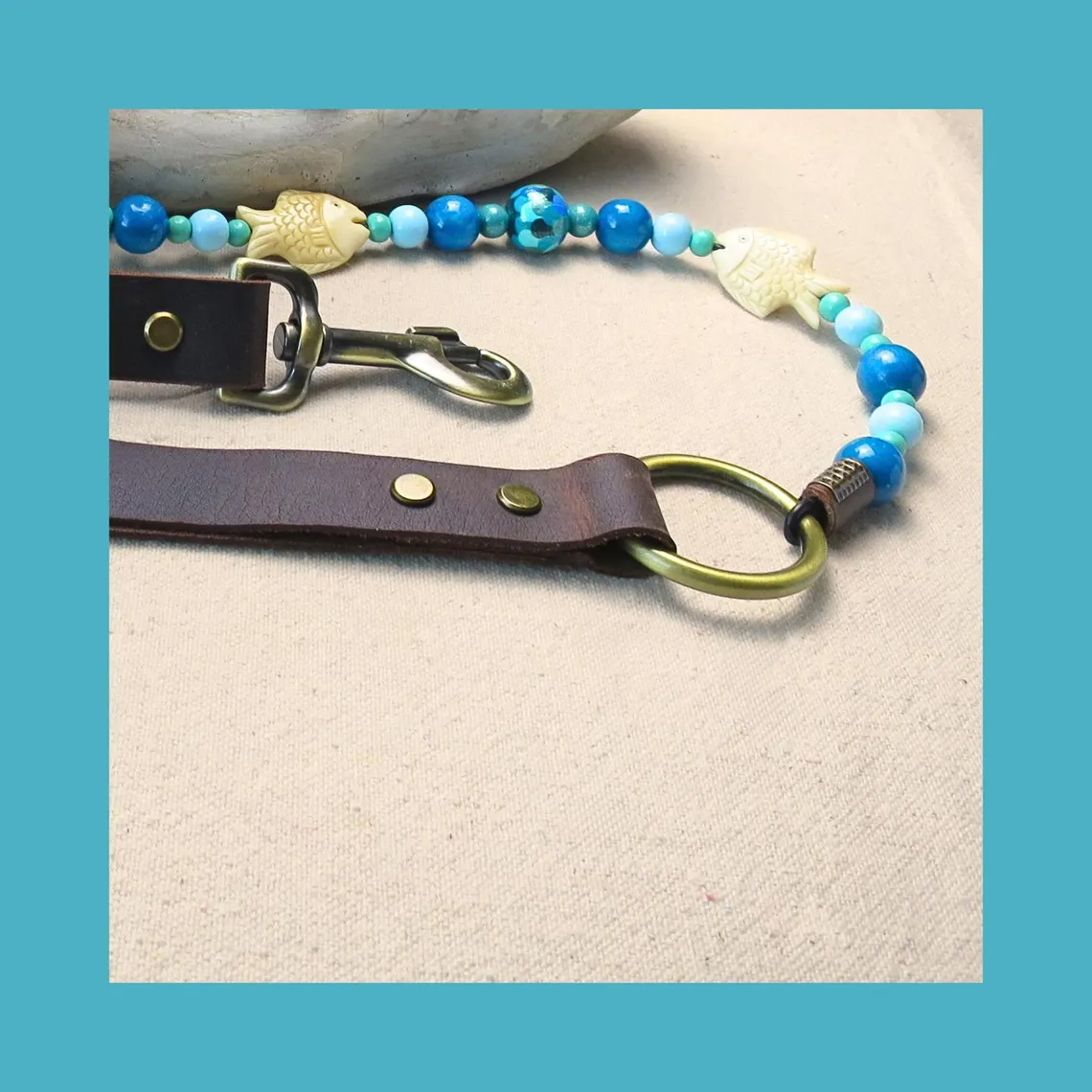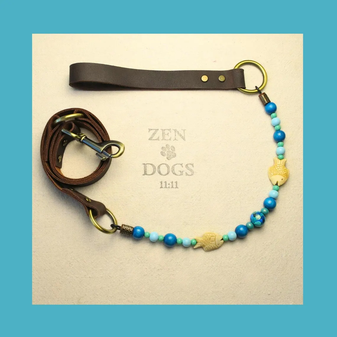 Walk with purpose, beauty, and spiritual symbolism. The Fortunate Fish Leash is a handcrafted leather dog leash adorned with symbolic beads that honor abundance, emotional flow, and transformation. Thoughtfully designed for durability and elegance, it brings a sense of calm and meaning to your daily walks.